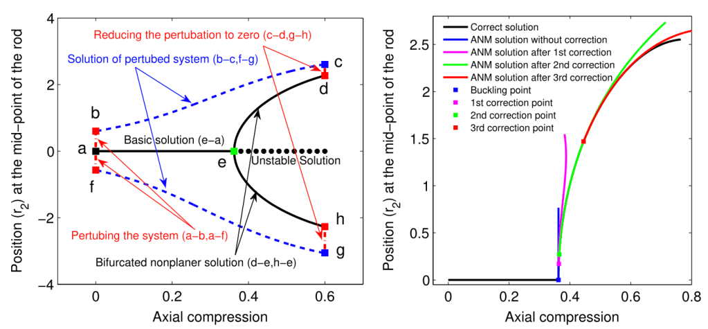 Bifurcation diagram of the hemitropic rod: (a) solution branch obtained using perturbation technique (b) solution branch obtained without perturbation
